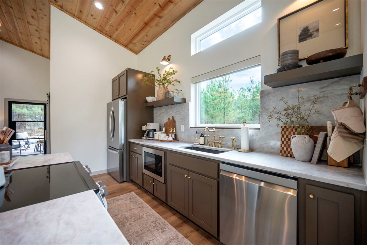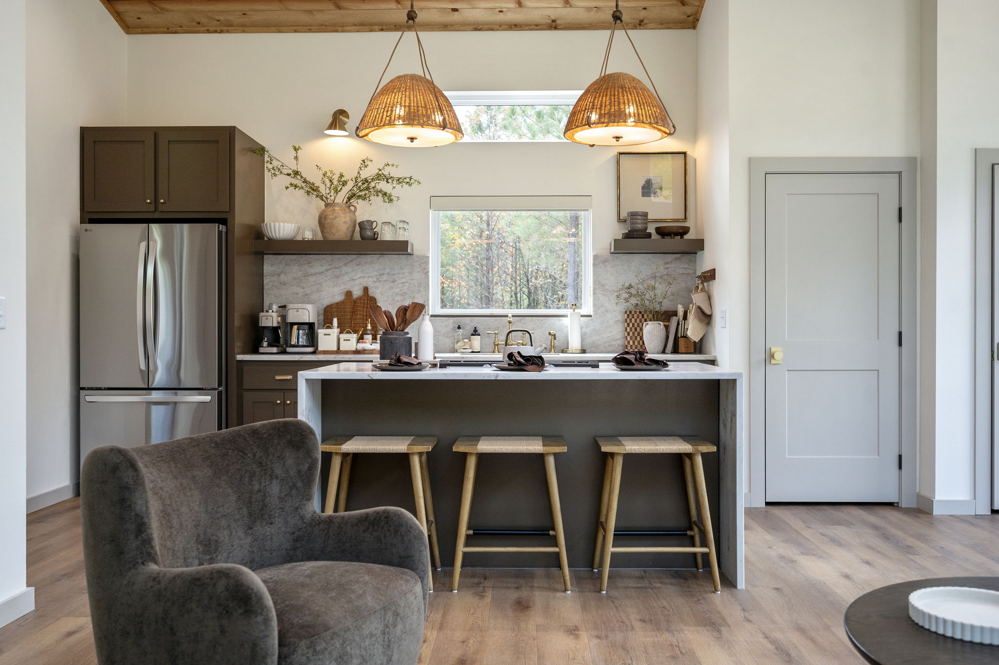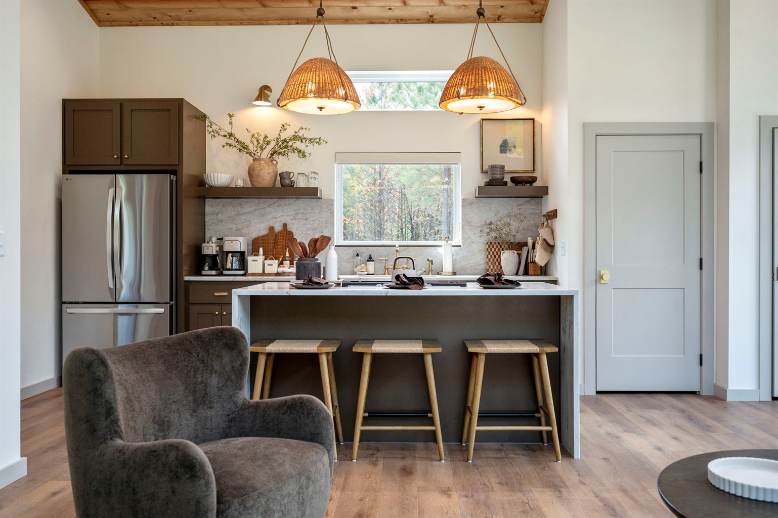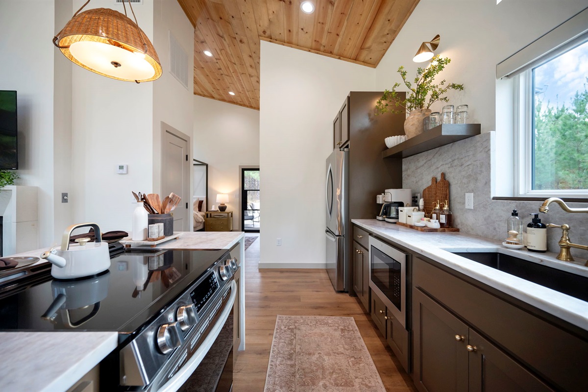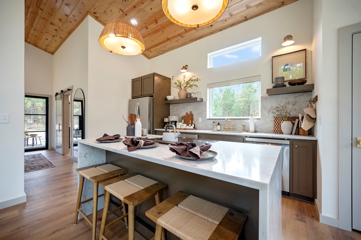 Cook, sip, and savor in a fully stocked kitchen with modern appliances and all the essentials, including spices and a coffee bar. Dine inside at the kitchen island or outside with beautiful forest views.