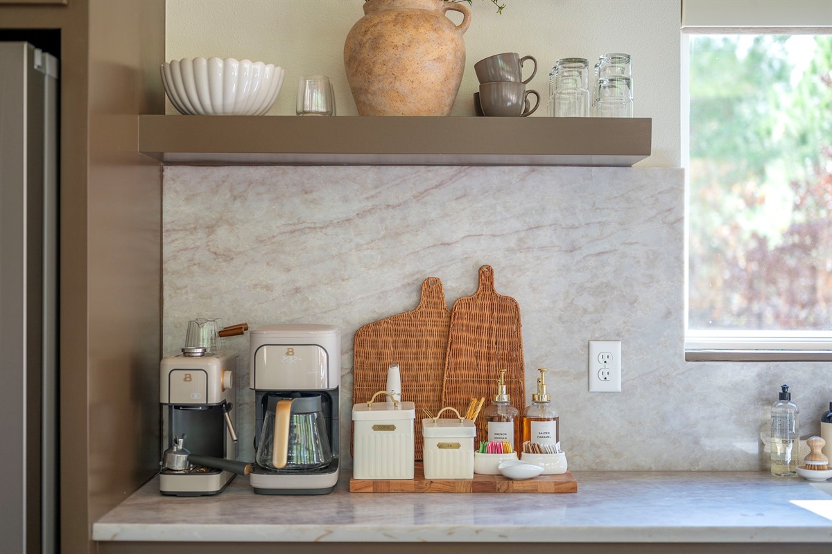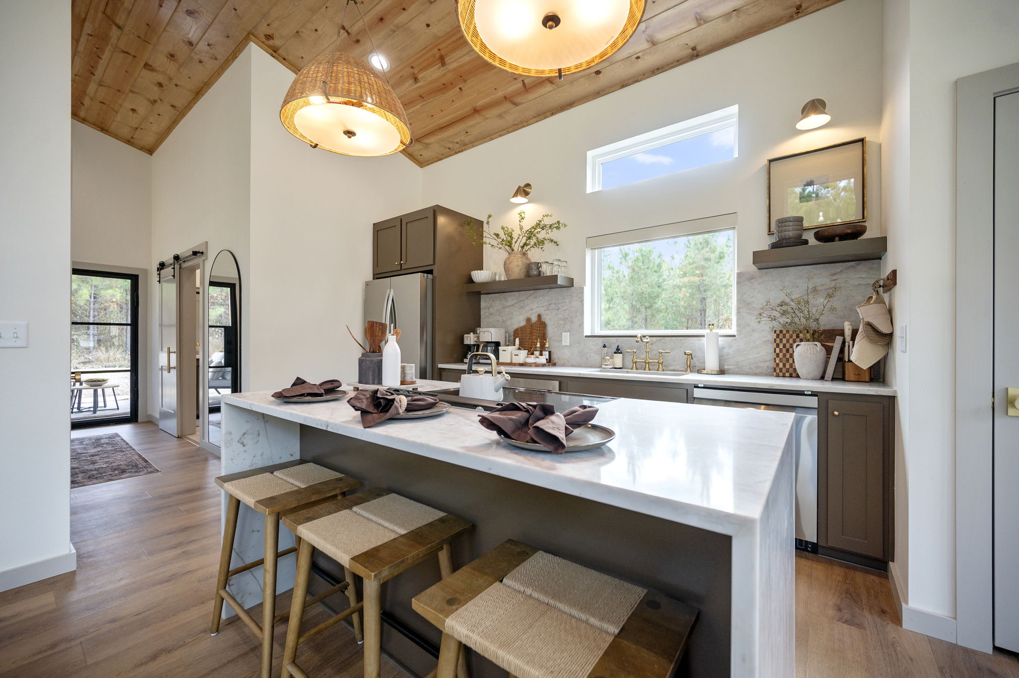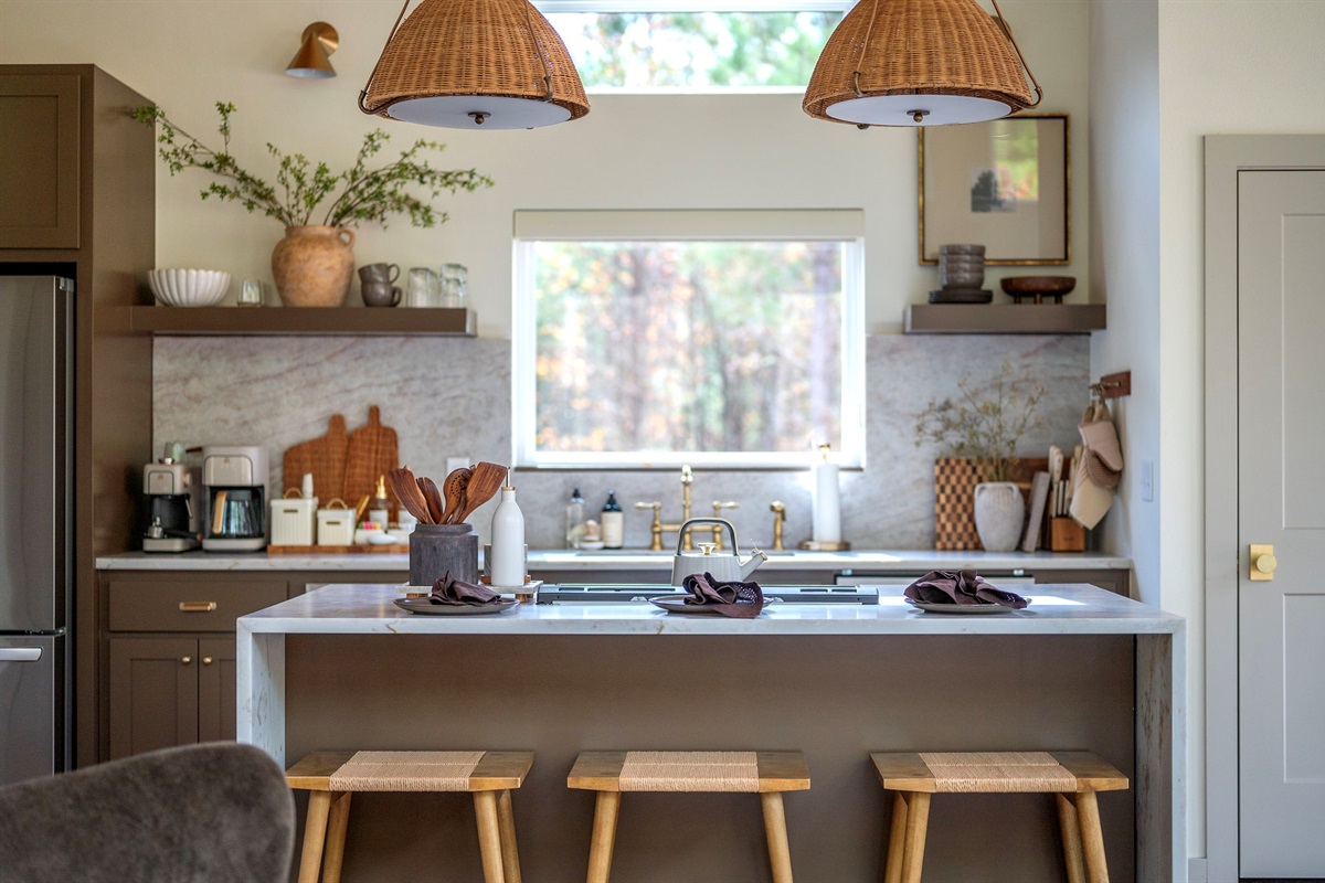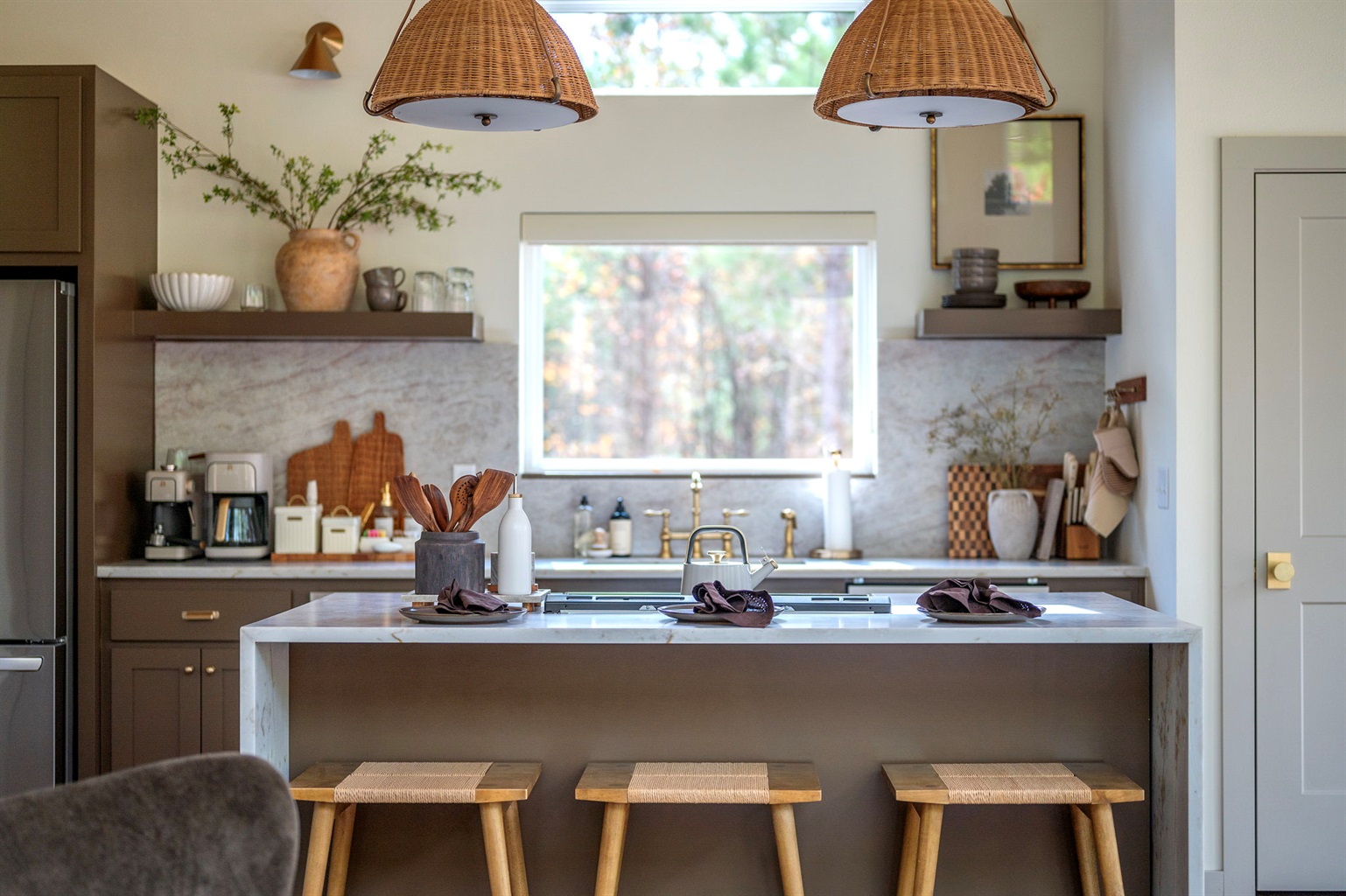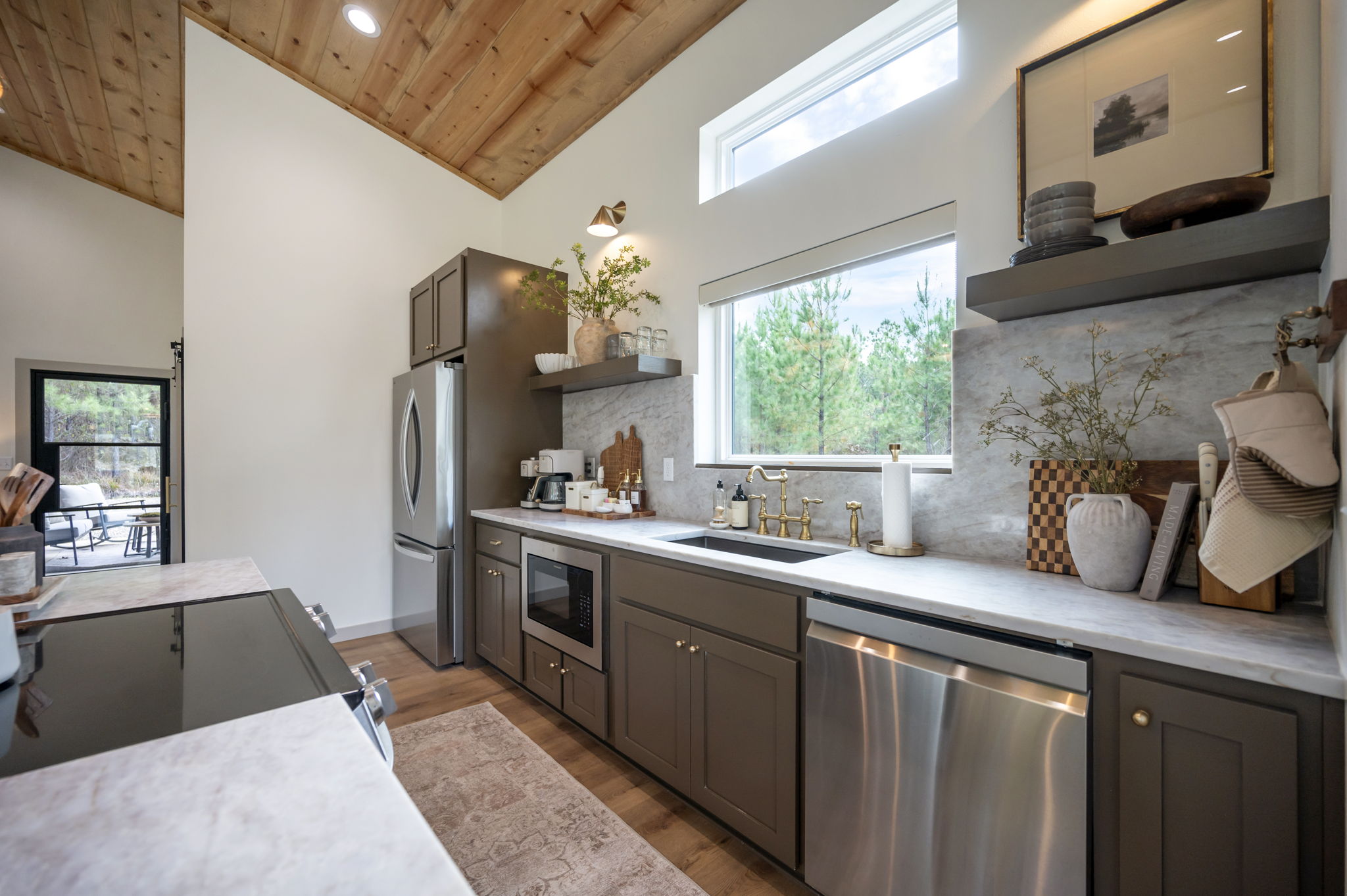 Cook, sip, and savor in a fully stocked kitchen with modern appliances and all the essentials, including spices and a coffee bar. Dine inside at the kitchen island or outside with beautiful forest views.