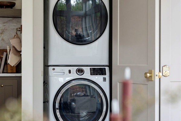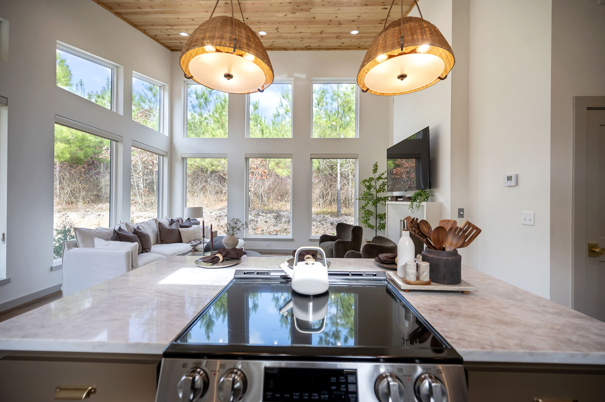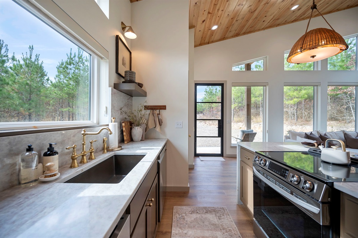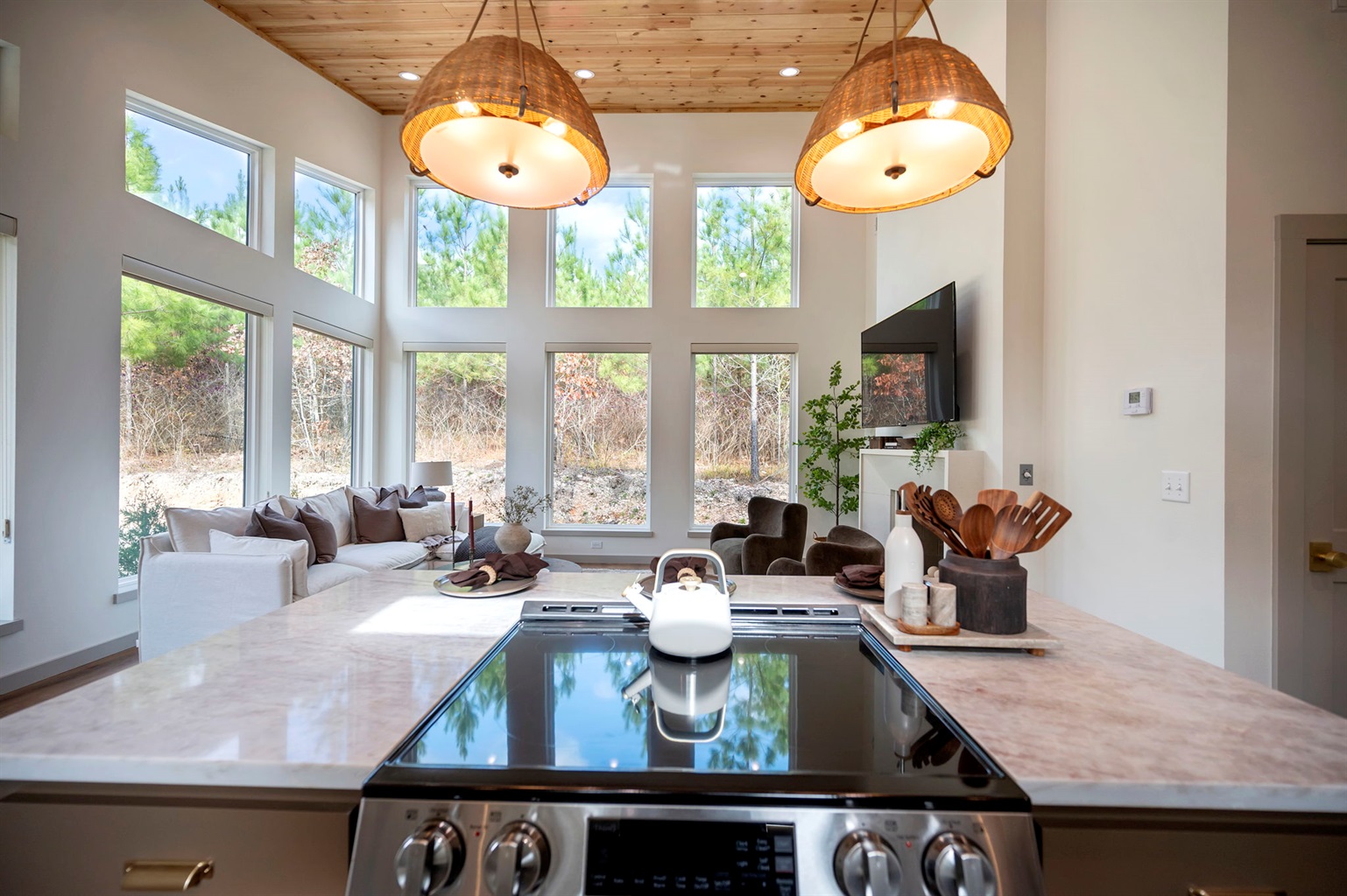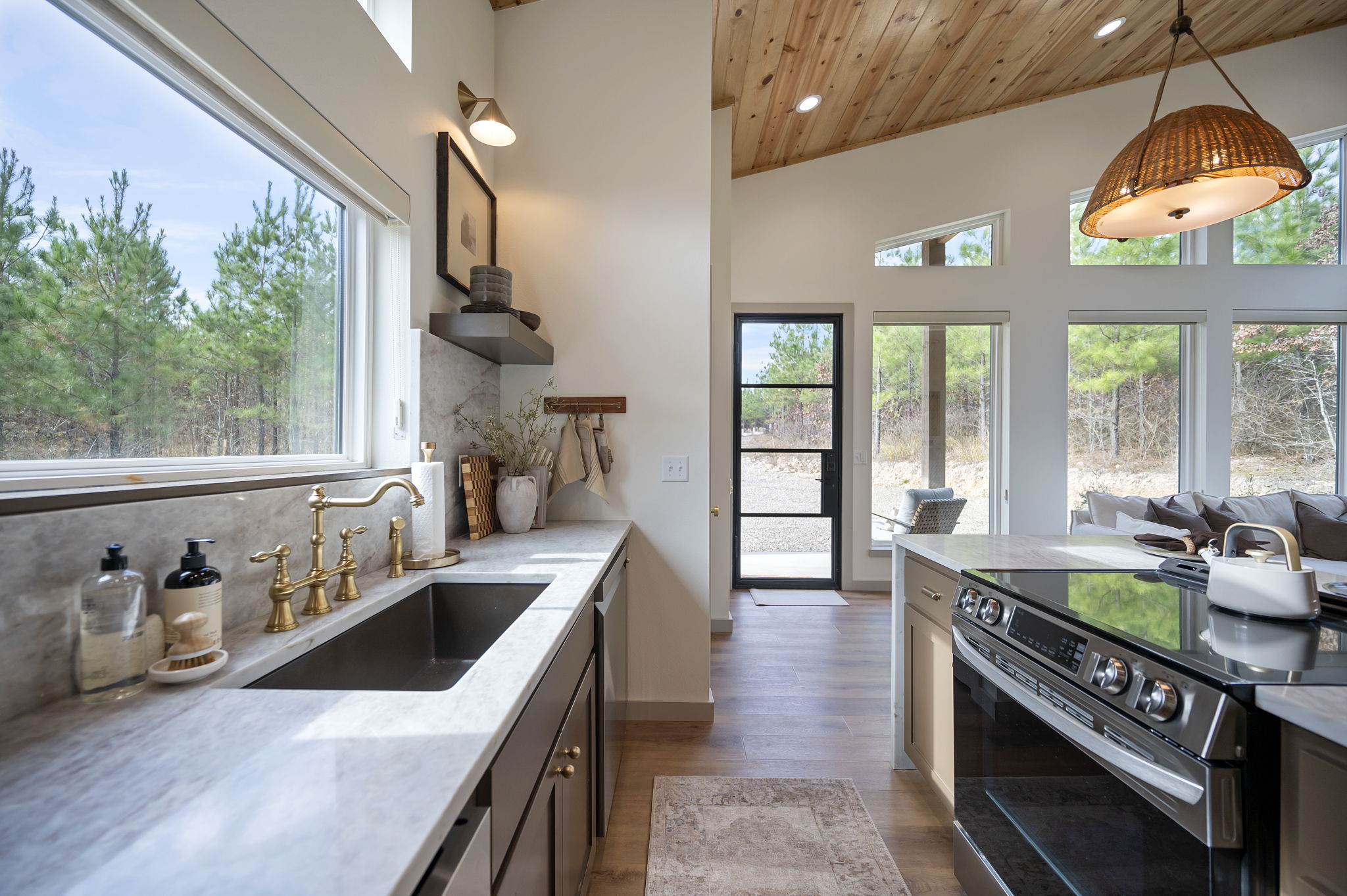 Cook, sip, and savor in a fully stocked kitchen with modern appliances and all the essentials, including spices and a coffee bar. Dine inside at the kitchen island or outside with beautiful forest views.