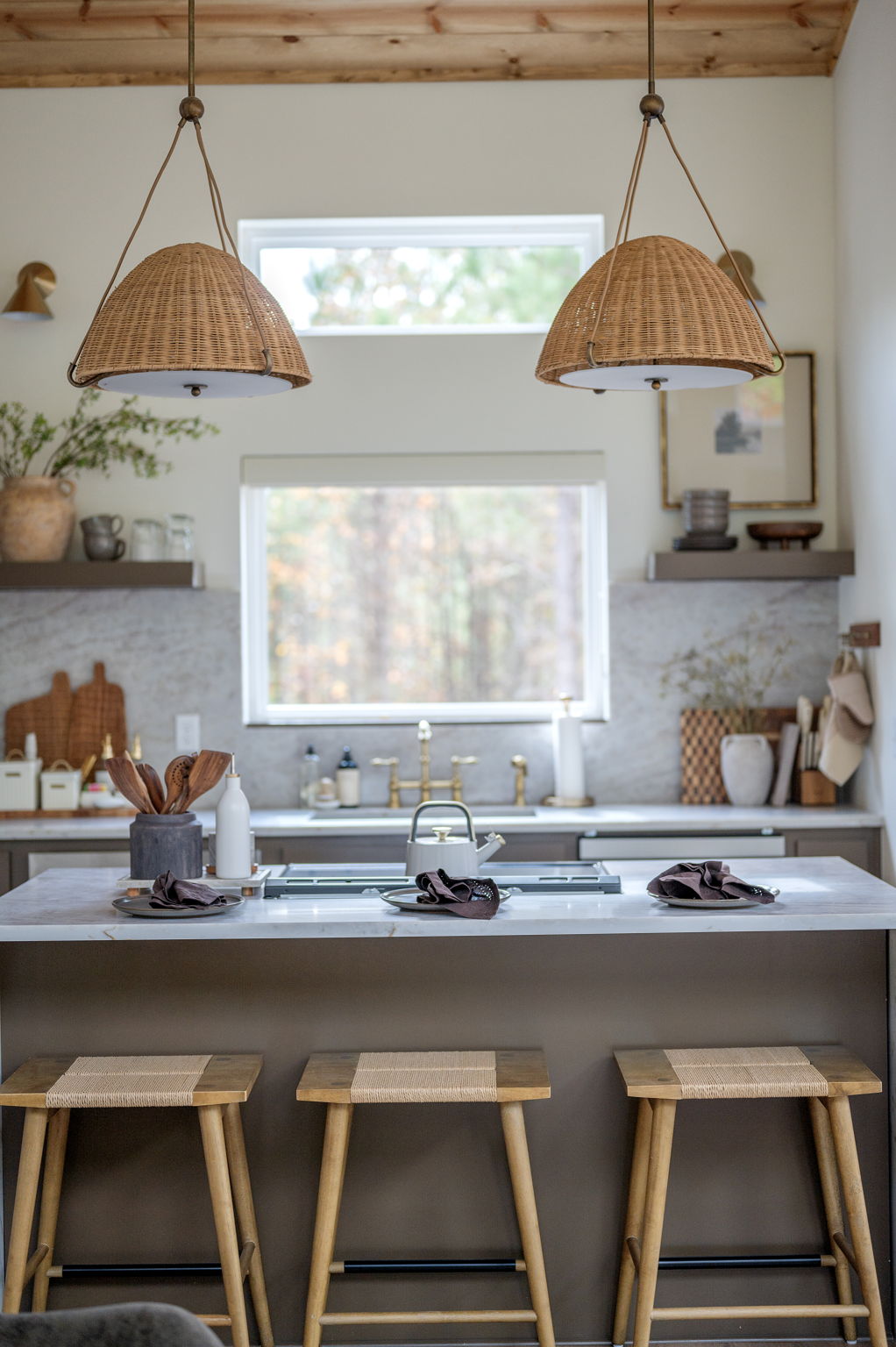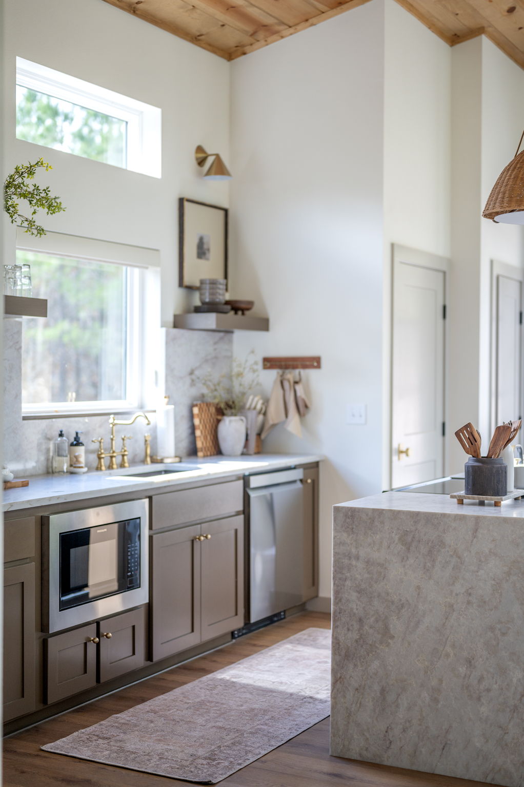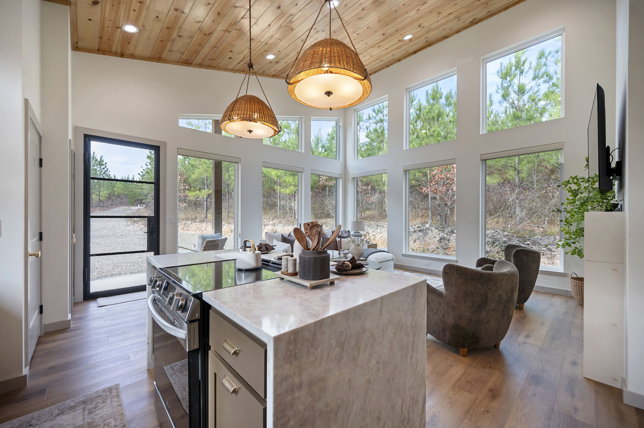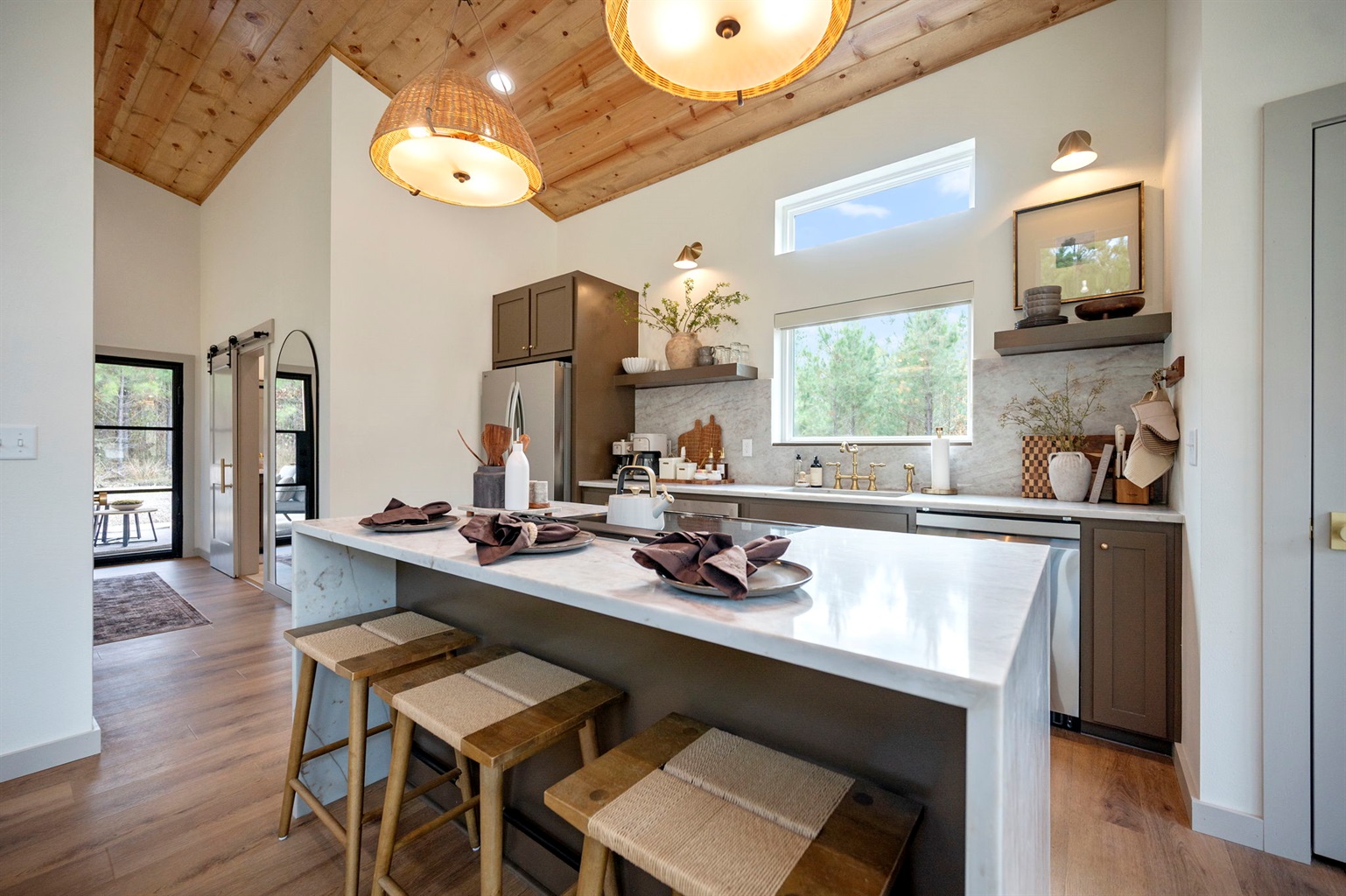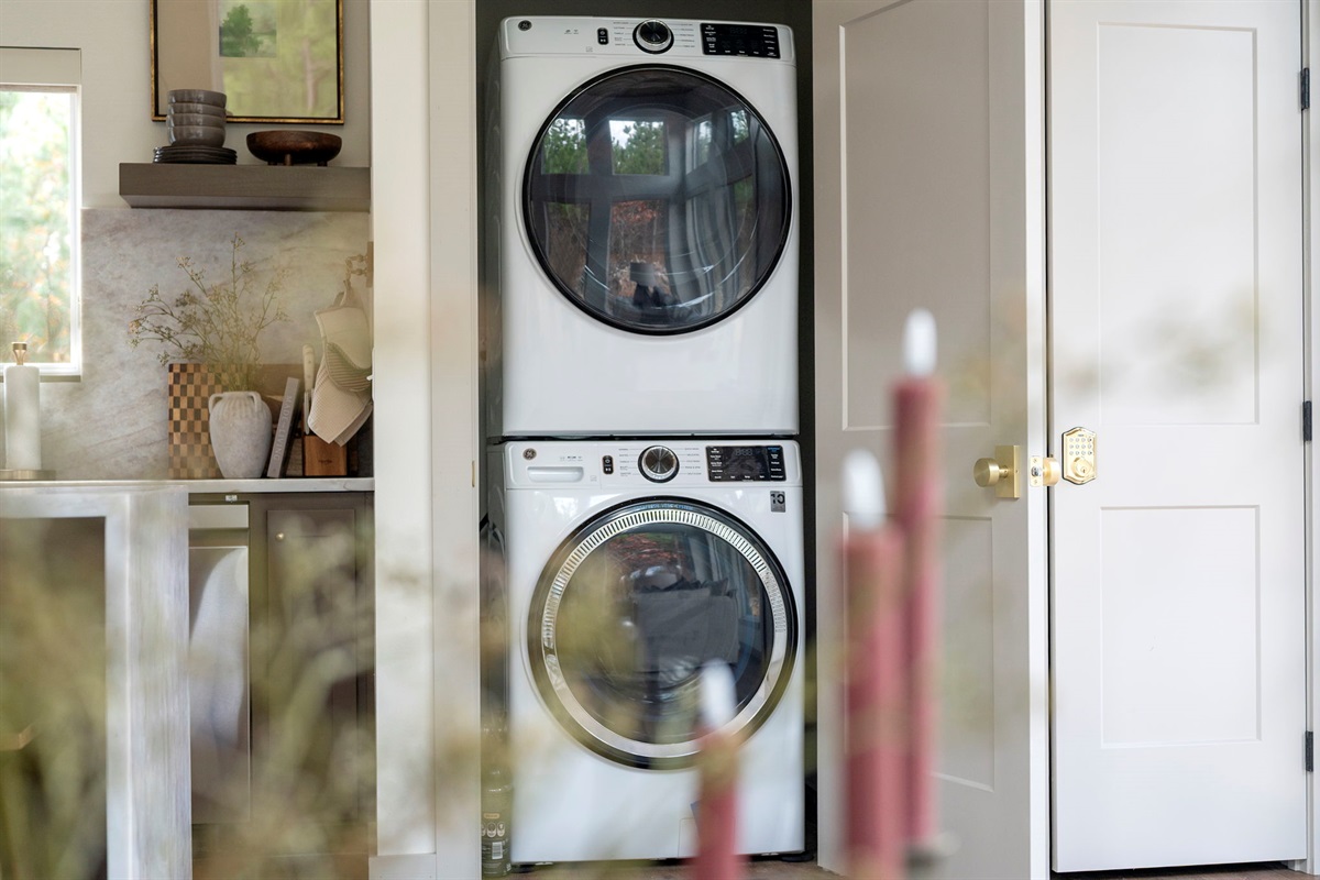 Cook, sip, and savor in a fully stocked kitchen with modern appliances and all the essentials, including spices and a coffee bar. Dine inside at the kitchen island or outside with beautiful forest views.