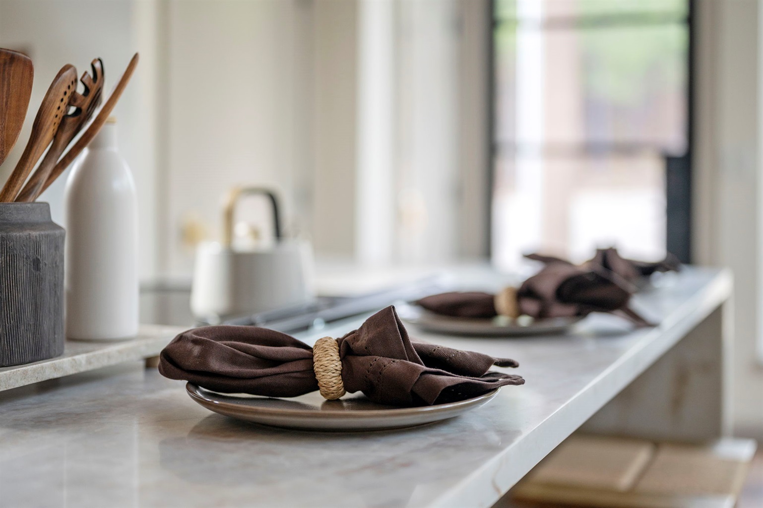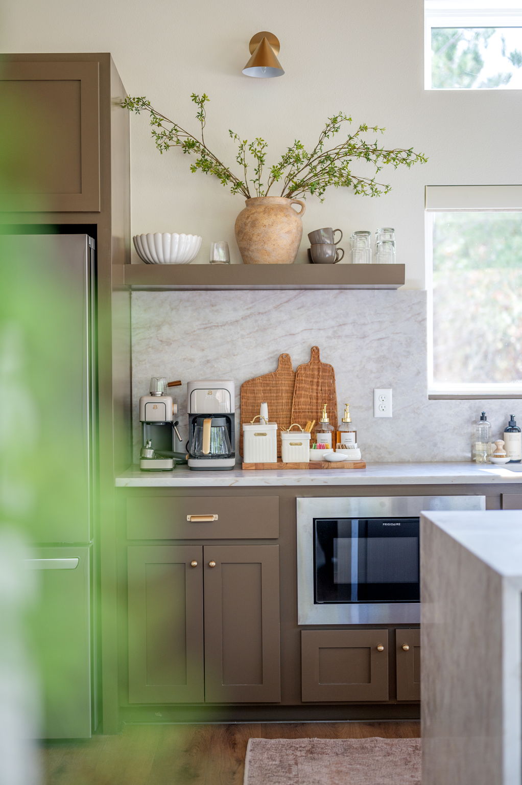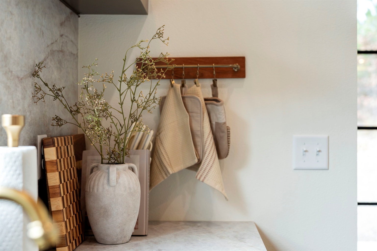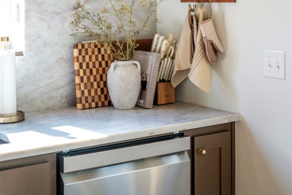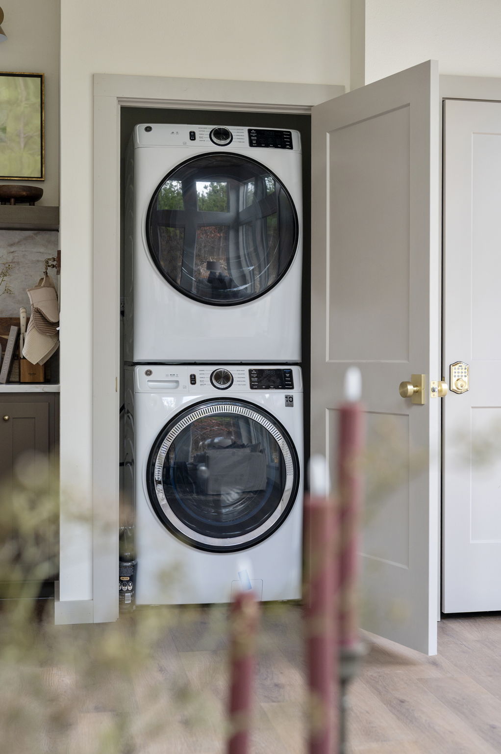 Cook, sip, and savor in a fully stocked kitchen with modern appliances and all the essentials, including spices and a coffee bar. Dine inside at the kitchen island or outside with beautiful forest views.