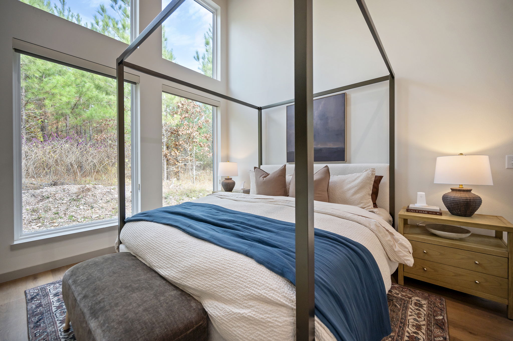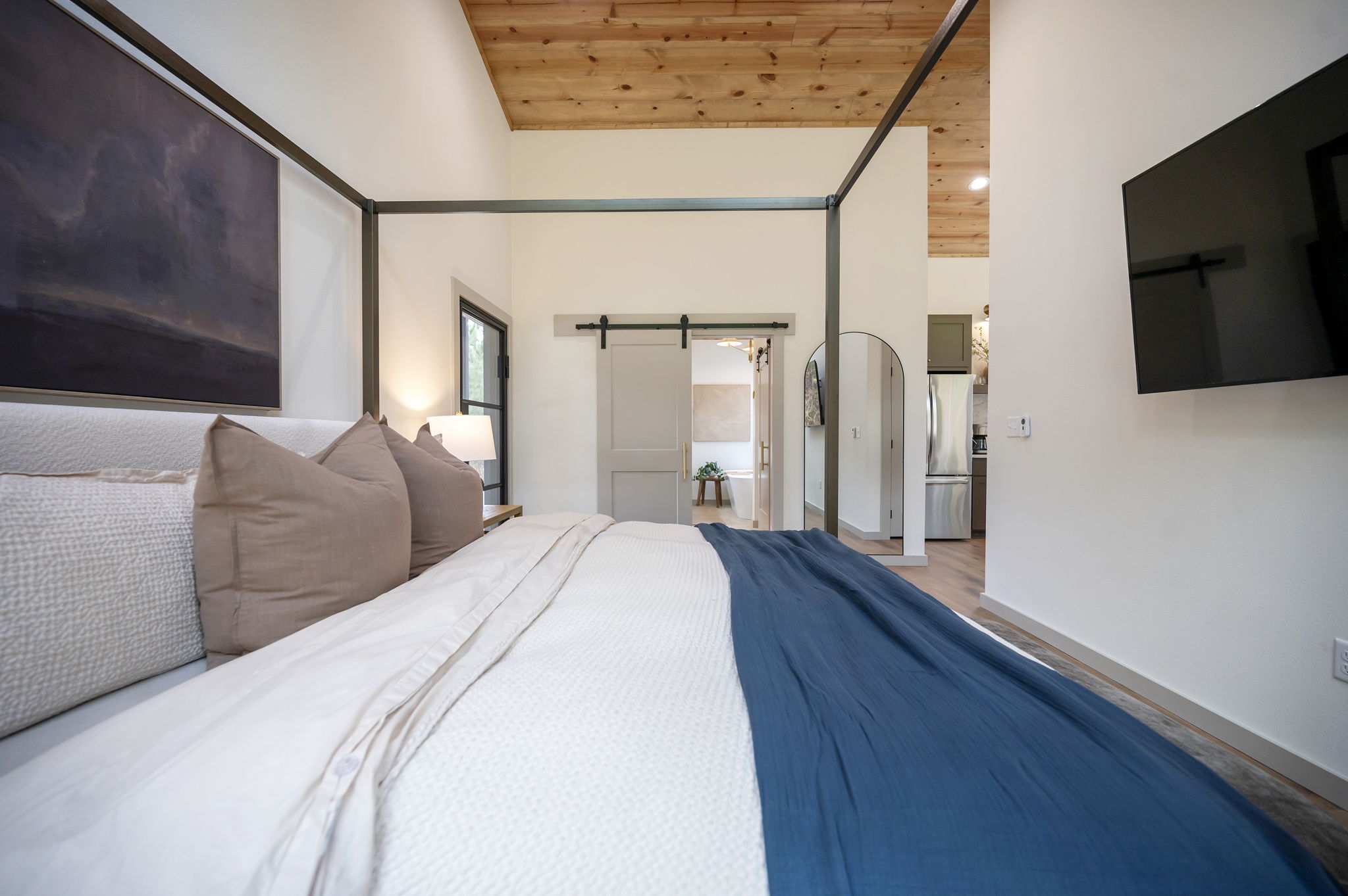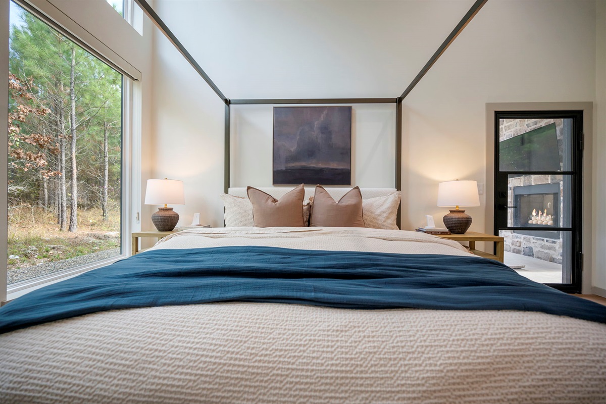 The bedroom is a serene retreat, blending modern luxury with cozy comfort. Drift off in the plush king-sized bed, wake up to peaceful forest views, and enjoy a restful night designed for relaxation.