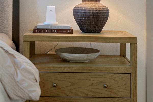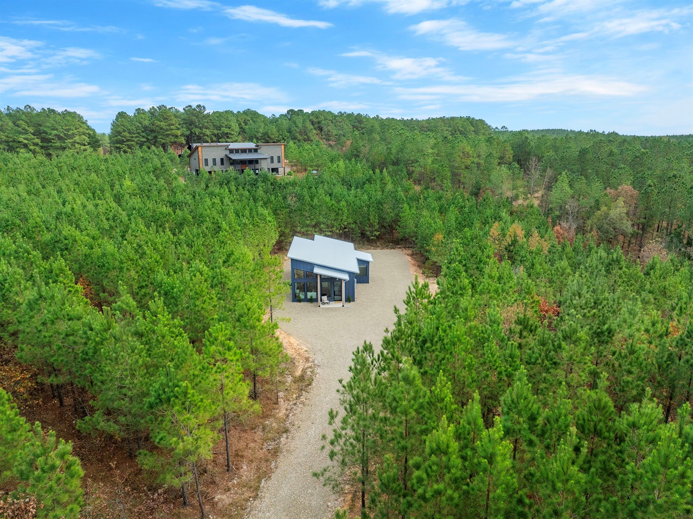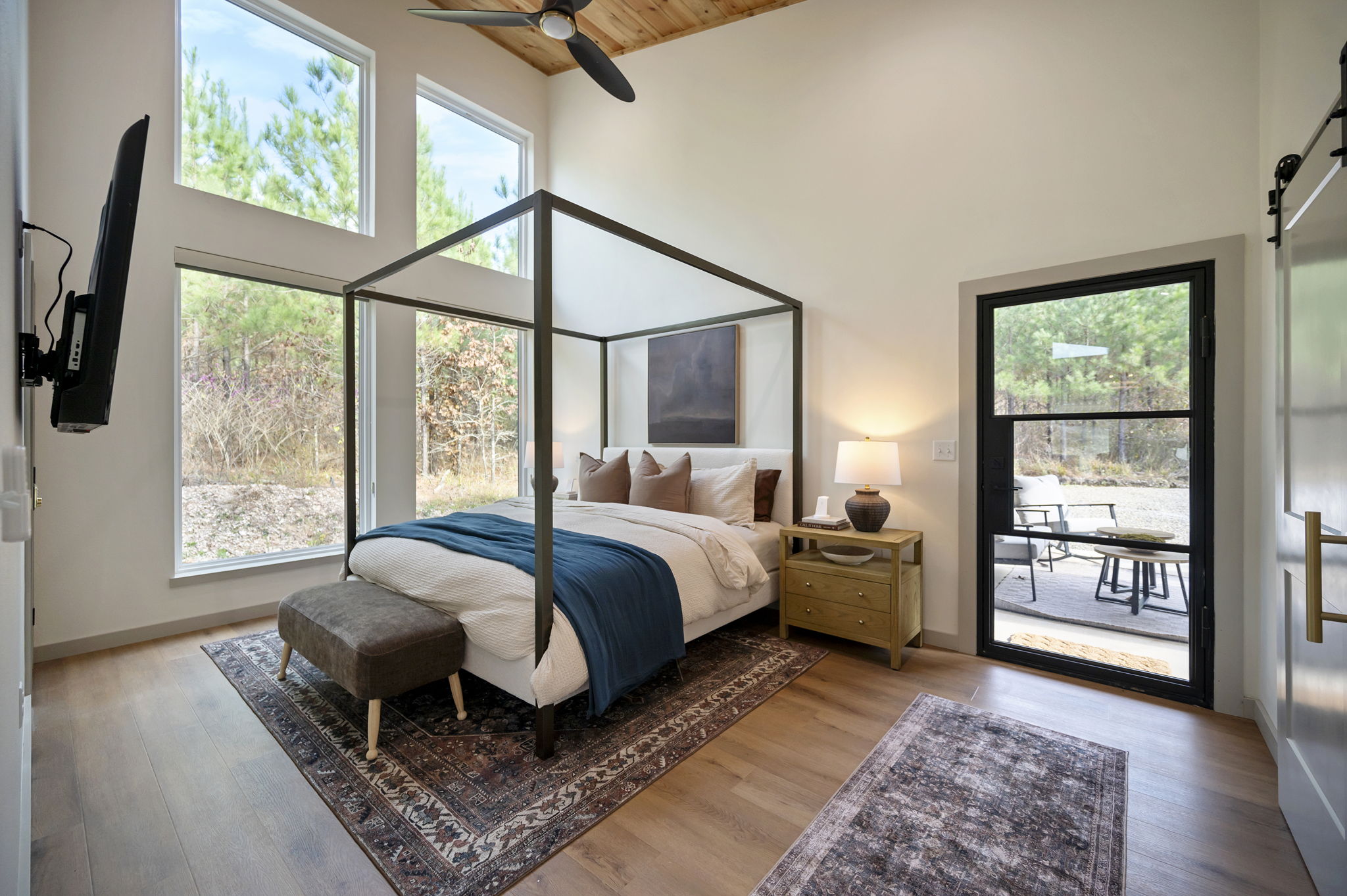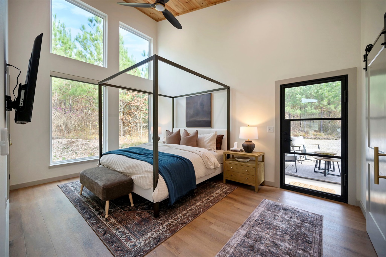 The bedroom is a serene retreat, blending modern luxury with cozy comfort. Drift off in the plush king-sized bed, wake up to peaceful forest views, and enjoy a restful night designed for relaxation.