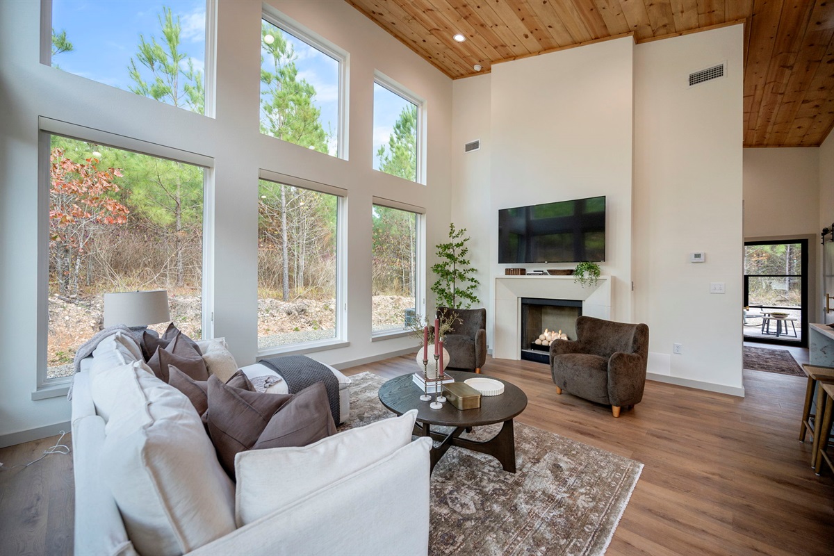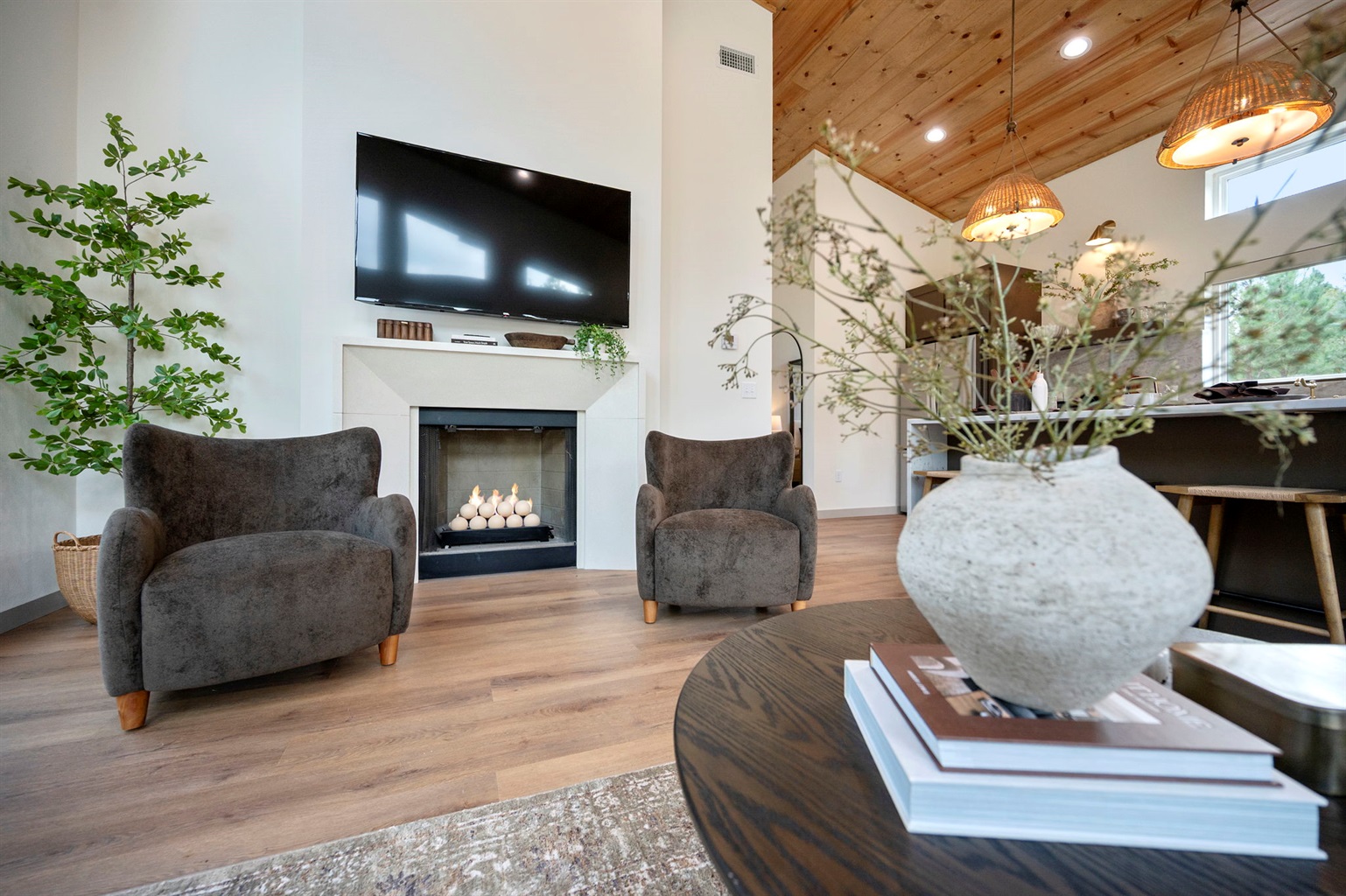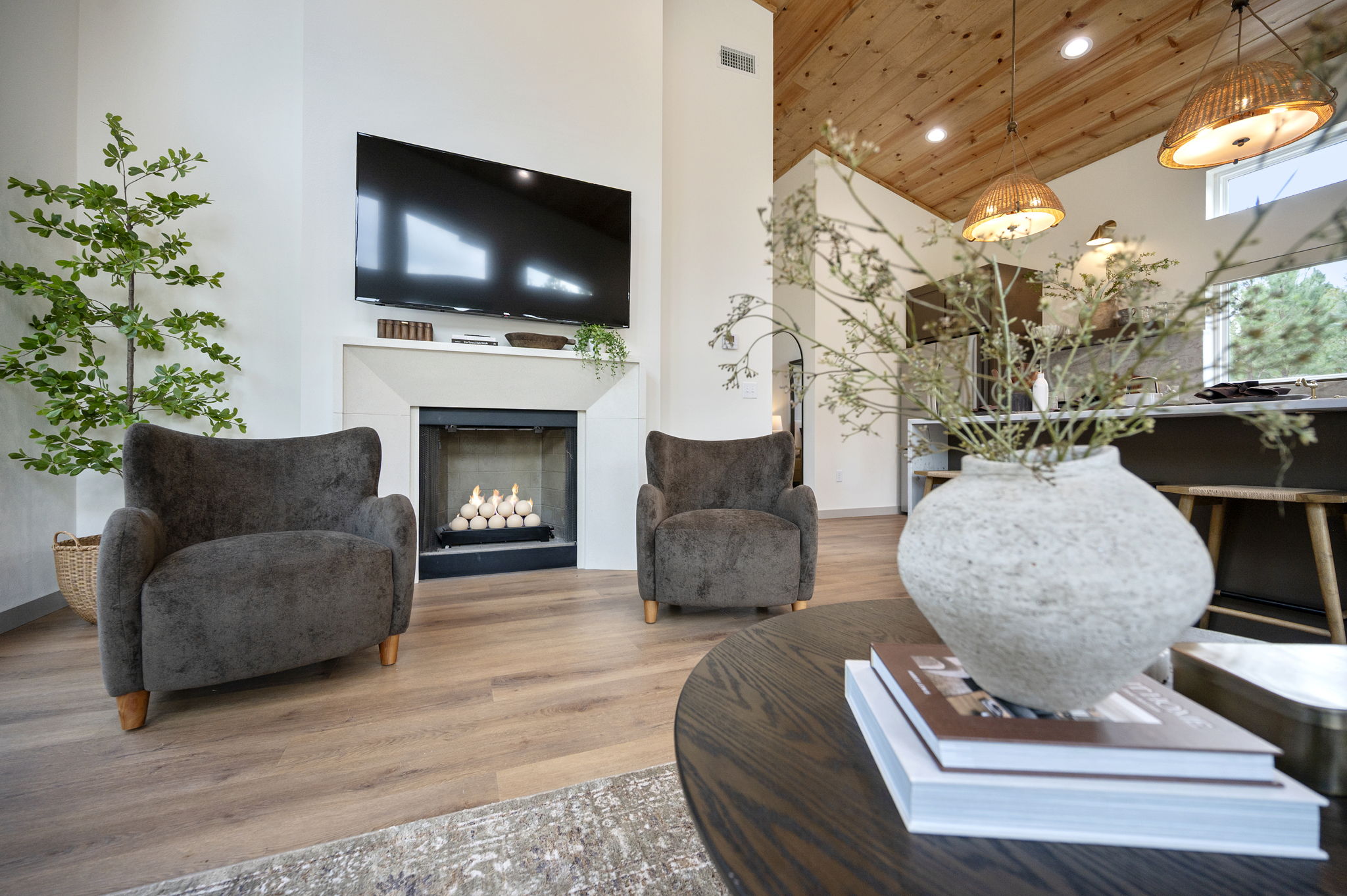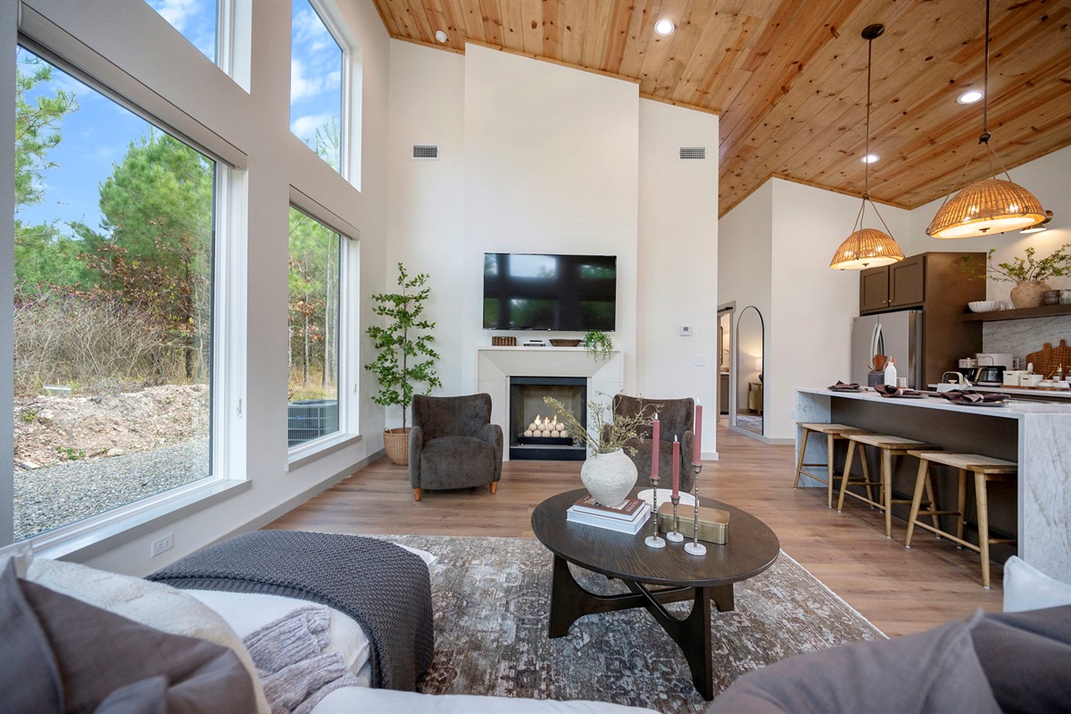 Relax in the modern, inviting living area with a fireplace and entertainment options. Perfect for snuggling up with a book, watching your favorite show, or simply enjoying the serene surroundings.