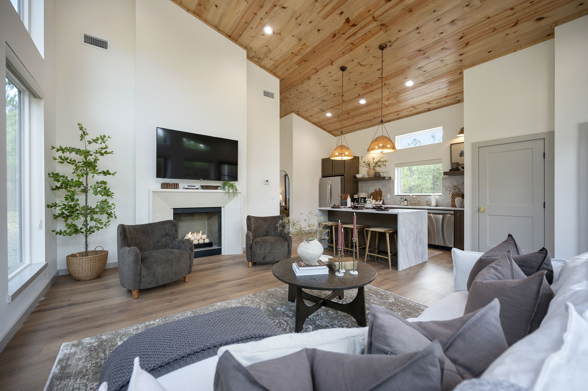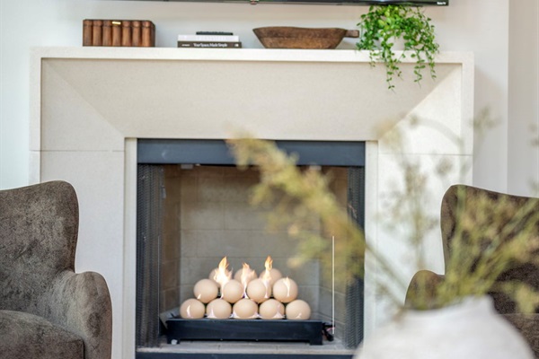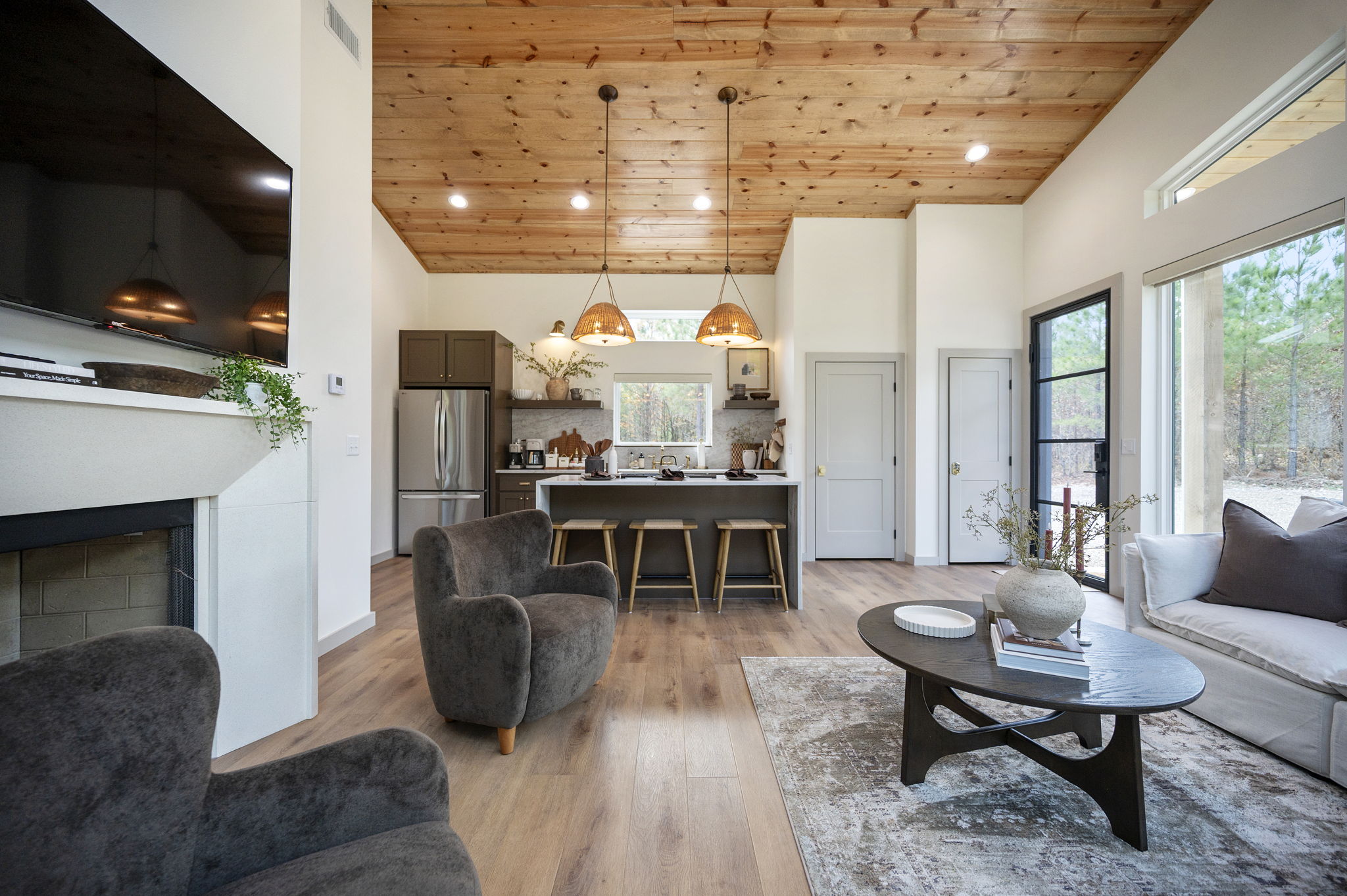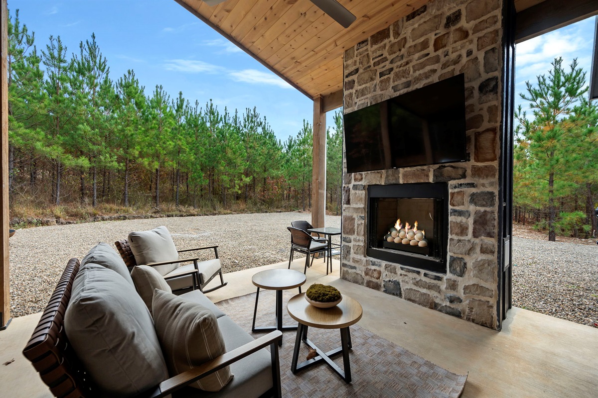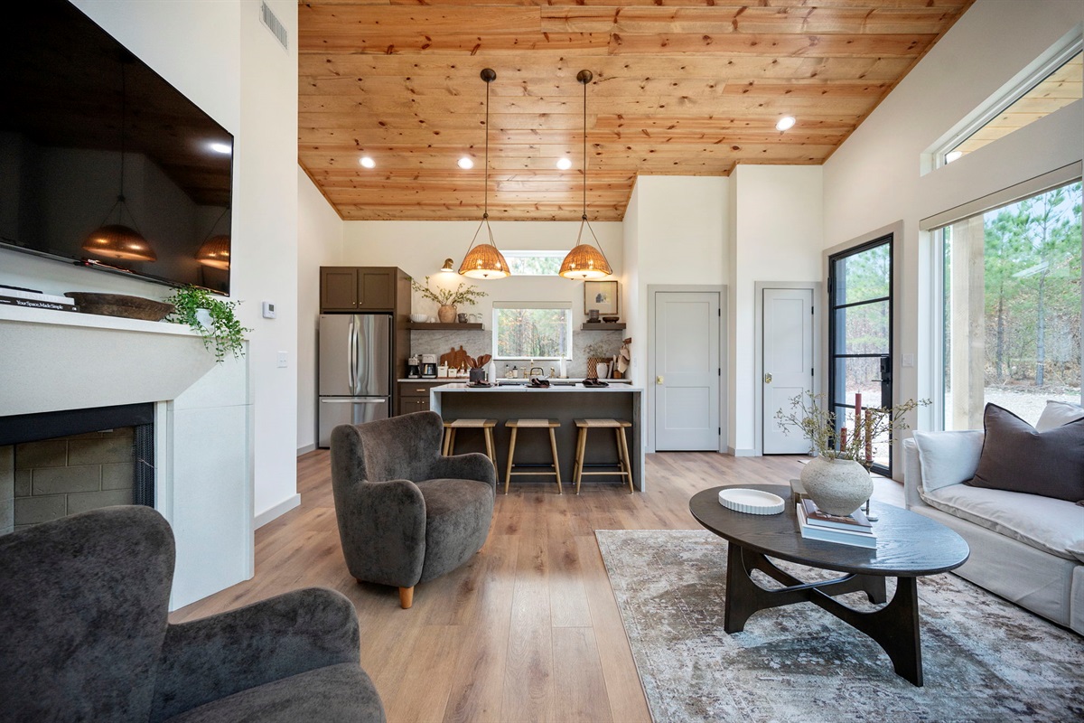 Relax in the modern, inviting living area with a fireplace and entertainment options. Perfect for snuggling up with a book, watching your favorite show, or simply enjoying the serene surroundings.