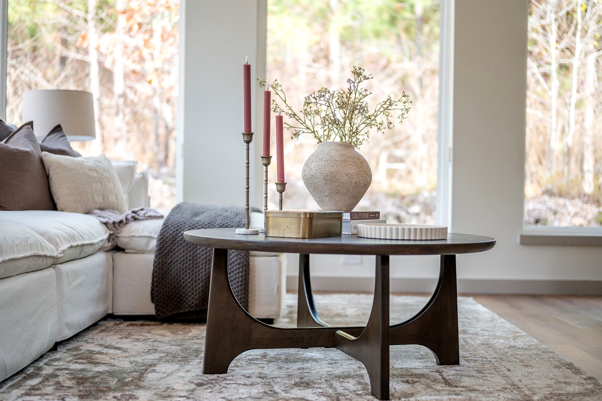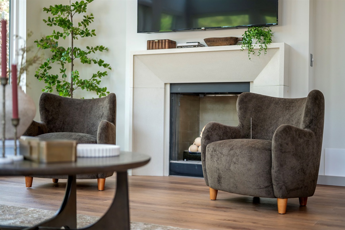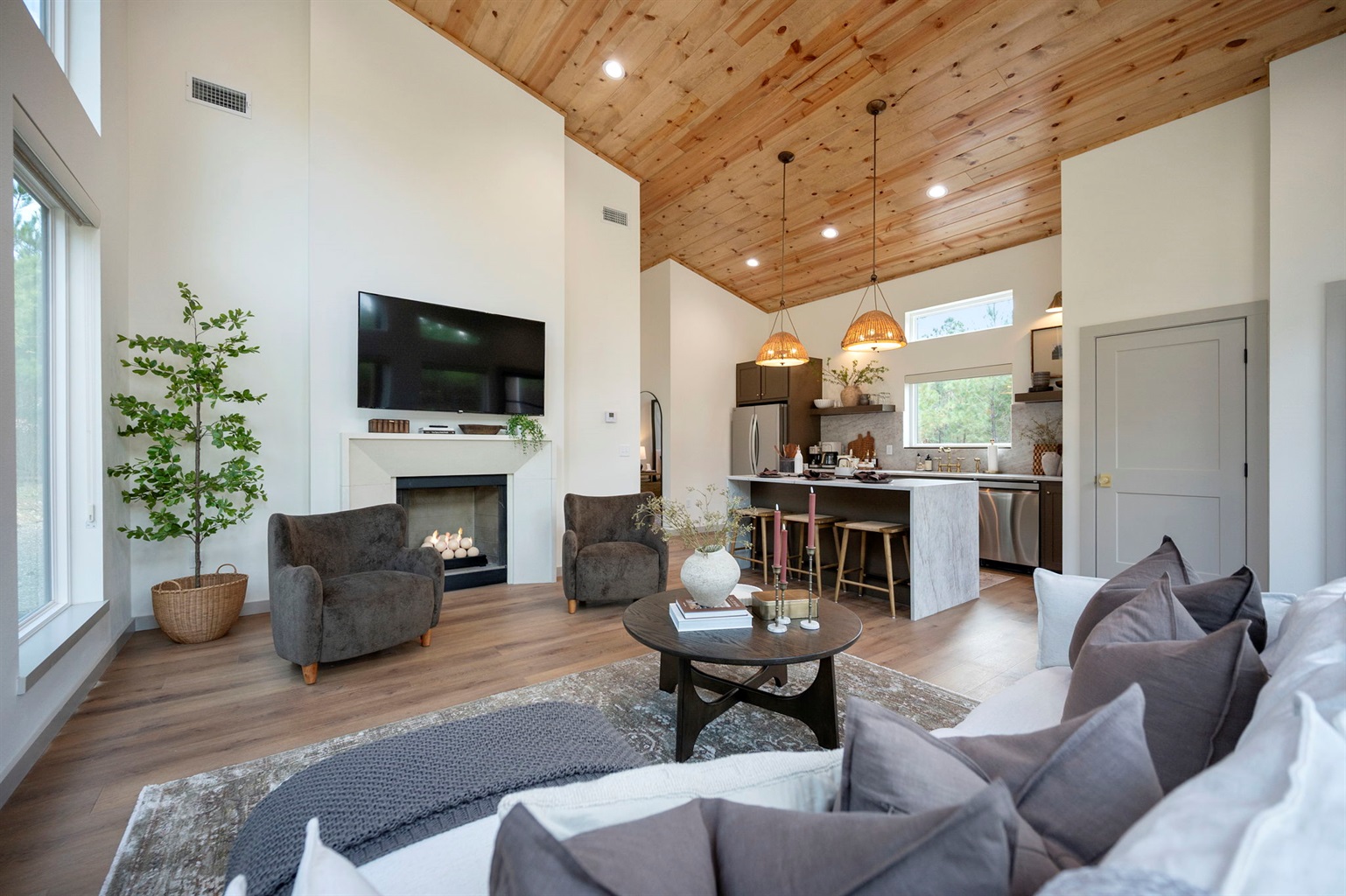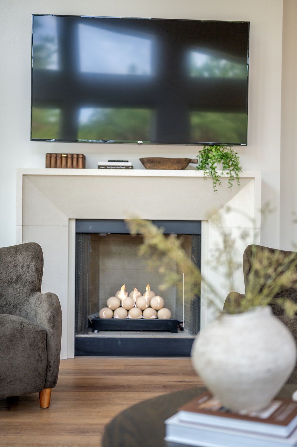 Relax in the modern, inviting living area with a fireplace and entertainment options. Perfect for snuggling up with a book, watching your favorite show, or simply enjoying the serene surroundings.